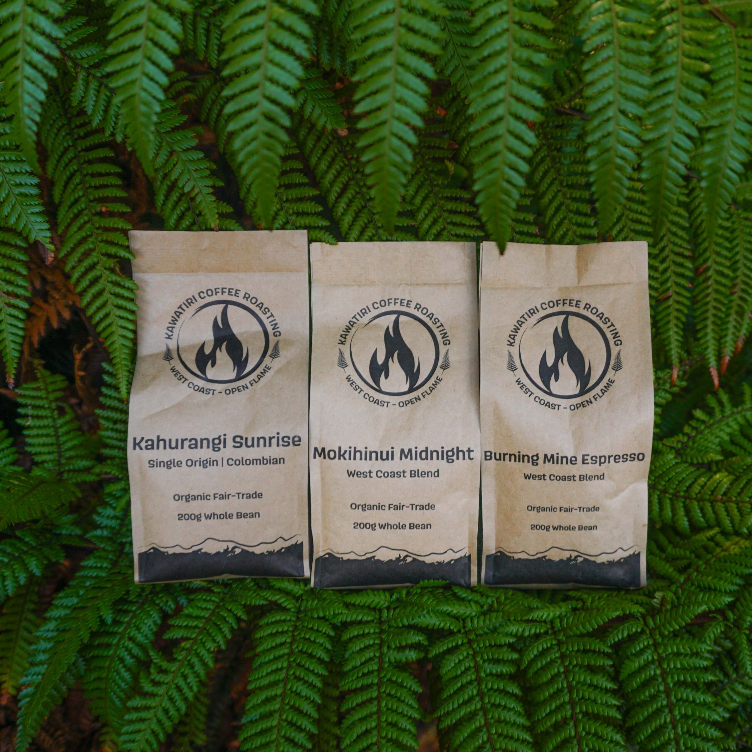 Get the perfect threesome Kahurangi Sunrise, Mokihinui Midnight, and Burning Mine Espresso in 200 gram bags of our open flame roasted coffee. Great gift idea for your coffee loving friends. We'll ship anywhere in New Zealand even to your father-in-law. Be sure to select either Whole Bean or the grind of your choice.